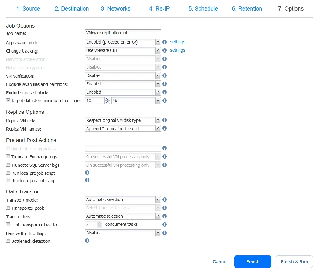 - Finally, you can choose a number of options to control the performance and security of the replication job, such as network acceleration and in-flight encryption. Here, you also name the resulting replica VM, set email options, and execute any pre- and post-job scripts.