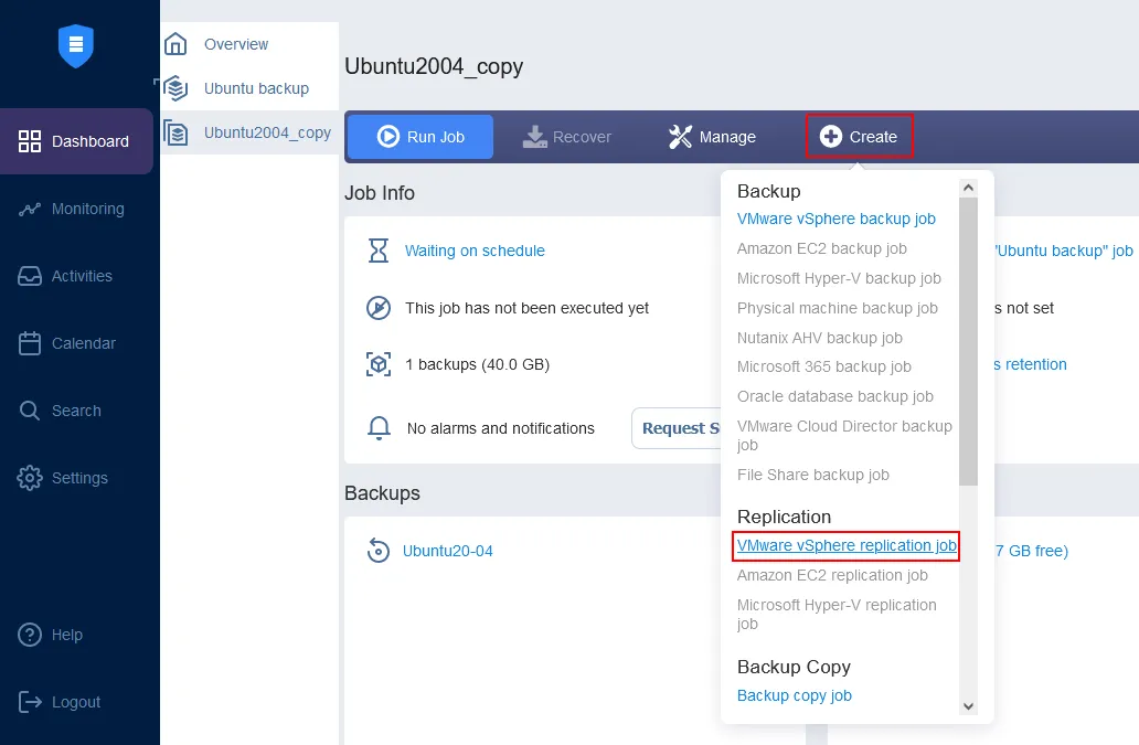 Open the dashboard, then click Create > VMware vSphere replication job.