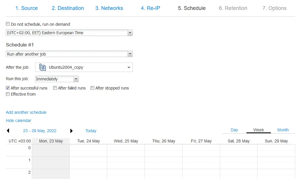 - We can schedule the replica VM to be created/updated after another job runs, such as the primary backup job. A calendar helps us see when other tasks are scheduled to avoid overlaps.