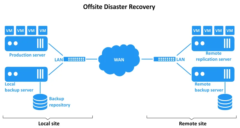 Storing backups and replicas away from the main environment is the foundation of offsite disaster recovery. With backups, you can save on storage requirements and other resources, which is also important when transferring data via a wide area network (WAN) or internet to a remote location. While replication is more resource-intensive but allows you to restore workloads in a shorter time.
