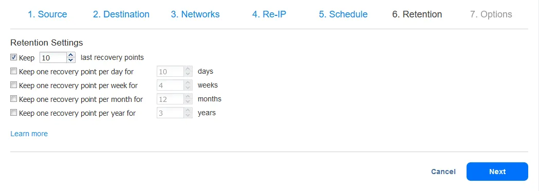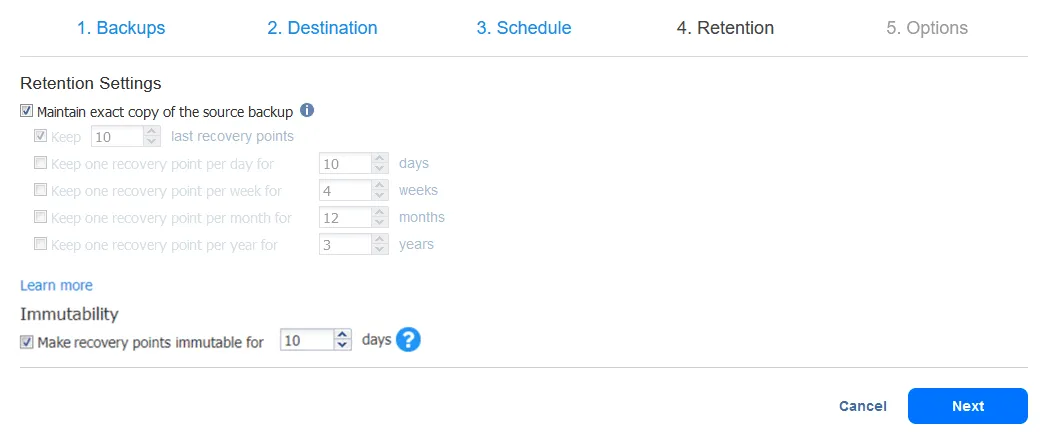 - We can select the retention period for the backup copy. As you can see below, the default is to keep the same number of points as for the source backup. When you select this option, the source backup retention policy is applied.
