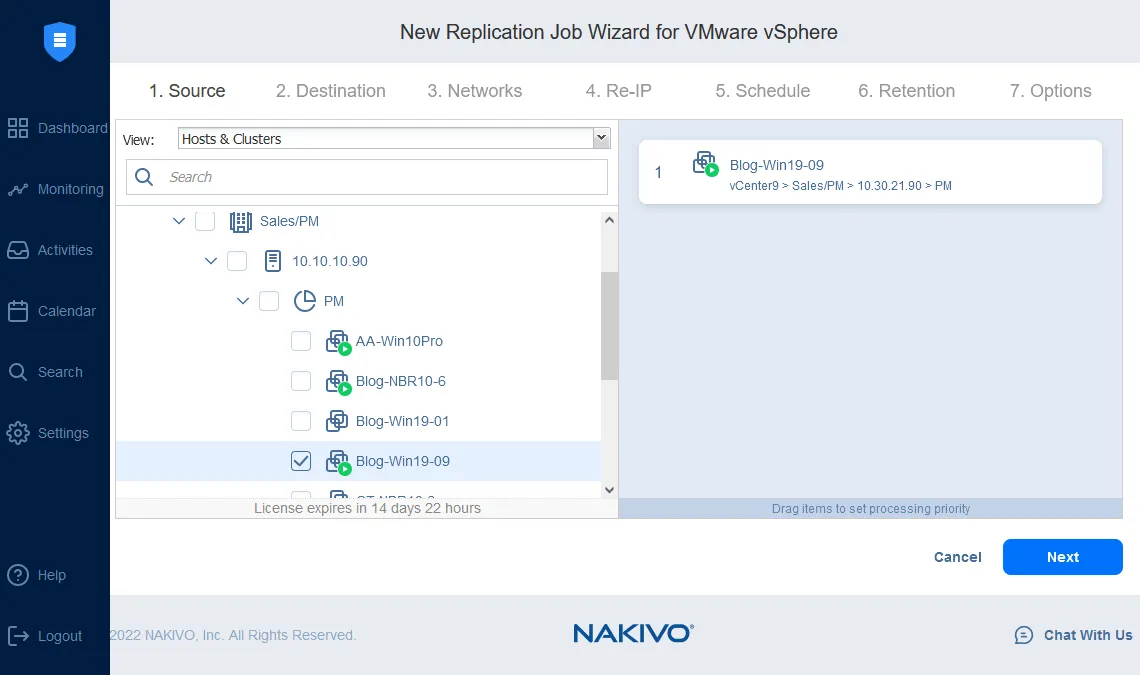 Replication allows us to create a standby replica VM for the virtual machine running in production. This standby replica VM can be onsite but ideally is stored offsite to have site failure resiliency. If we lose an entire site, we can start failover to the standby replica VM that is already provisioned in the offsite disaster recovery (DR) facility. Let’s look at how easy it is to set up a replication job in NAKIVO Backup & Replication.